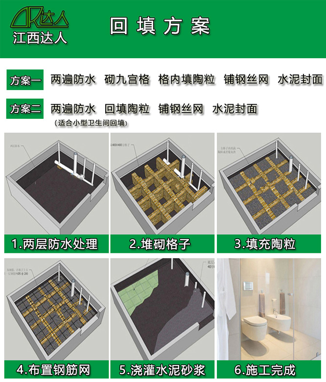 4.  箱回填約4/5時,用水泥沙漿找平約30mm-60mm,要壓實.如放置浴缸處必須加φ6鋼筋做成20cm方格狀.
